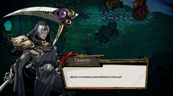 Танатос является одним из немногих персонажей, с которым мы не встретимся в бою при попытке побега. Наоборот, он иногда «навещает» Загрея, предлагая ему челлендж с убийством мобов на время. При победе наделит того довольно ценной наградой, увеличивающей здоровье.