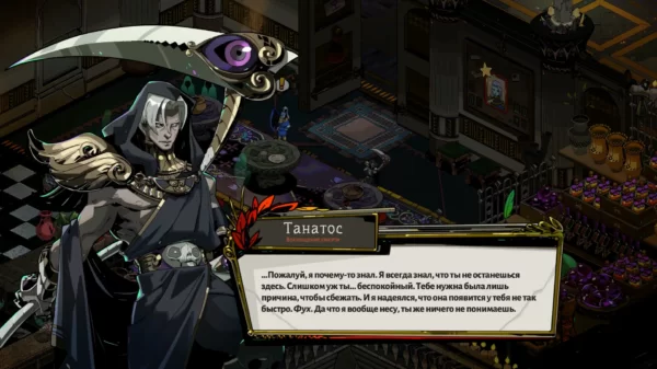 На этом можно считать их отношения устоявшимися. Танатос все еще будет иногда появляться в забегах Загрея и предлагать состязание, а после и в Доме.