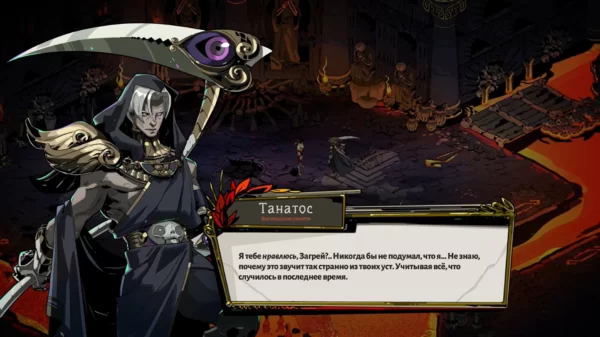 Из интересного: окружающие персонажи будут отмечать, что Танатос стал куда более приятным парнем. Гермес расскажет Загрею, что «видел как Танатос немного улыбнулся». Да и отношения с братом-близнецом Гипносом у него станут куда теплее с подачи Загрея. Афродита, как богиня Любви, тоже отметит изменения в их отношениях.