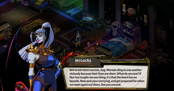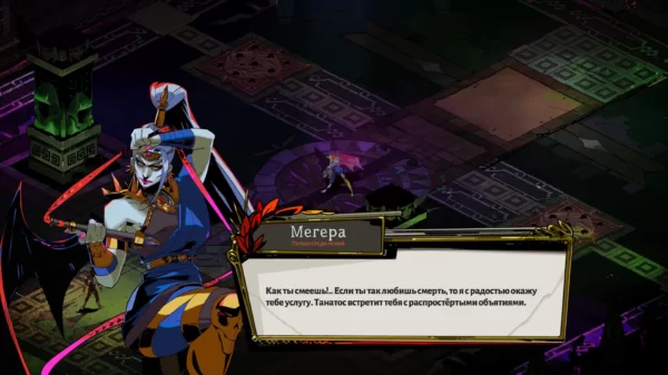 Романтические отношения с Мэг требуют усилий и настойчивости. Как минимум, несколько раз придется победить ее в бою. После каждой битвы у Загрея будет возможность поговорить с ней в Комнате отдыха.