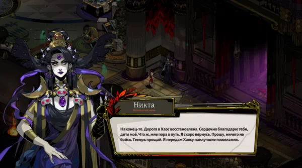 Когда Загрей преподнесет по 6 нектаров и Никте, и Хаосу, последний предпримет попытку связаться с дочерью самостоятельно. О чем мы узнаем непосредственно от Матери-Ночи. После этого Загрею нужно прокачать до максимального уровня отношения с обеими хтонями.