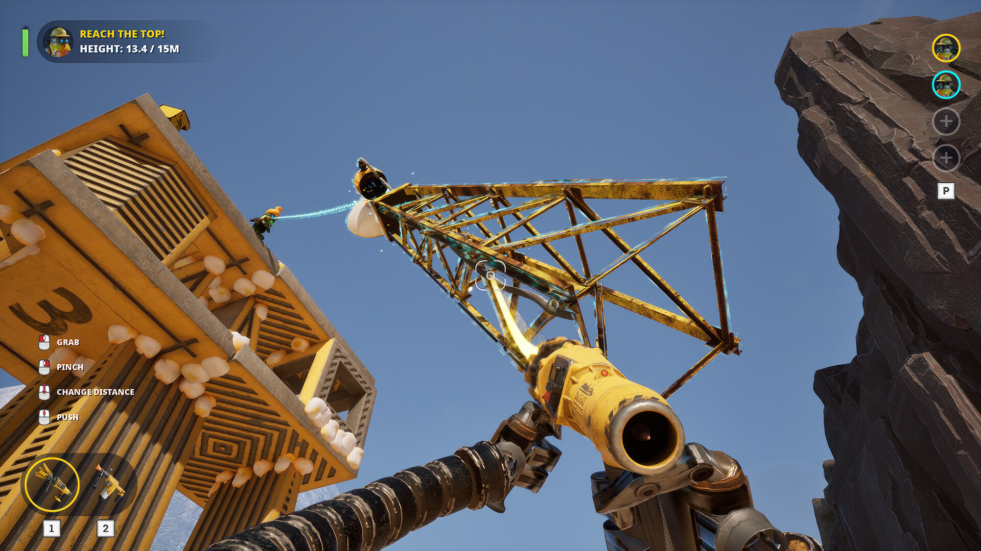 Основная механика строительства завязана на физическом движке. Каждый устанавливаемый блок имеет реальный вес и напрямую влияет на устойчивость всей конструкции. Достаточно одной неточности, и возведённая башня может рухнуть, превратив усилия команды в зрелищный провал. Чтобы справляться с такими ситуациями, игрокам выдают набор необычных инструментов: гравитационную пушку для перемещения деталей, пеногенератор для временной фиксации и реактивный ранец для быстрого перемещения по шатким этажам. Позже в распоряжении команды появляется и тяжёлая техника — например, гравитационный танк, способный передвигать целые секции, или гибрид бульдозера и дробилки, который может как расчищать пространство, так и создавать новые проблемы.