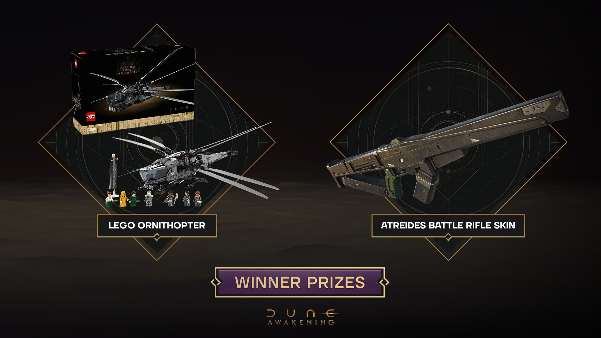 Работы принимаются до 28 июля 2025 года через социальные платформы с обязательными тегами @duneawakening и #DuneAwakening. Допускается до 20 изображений или одно видео длиной не более двух минут. Редактирование снимков запрещено. Три победителя (по одному от каждой фракции) получат конструктор LEGO «Орнитоптер Атрейдесов». Шесть призёров будут награждены коллекционными наборами по мотивам игры. Дополнительные поощрительные призы включают внутриигровую боевую винтовку Атрейдесов.