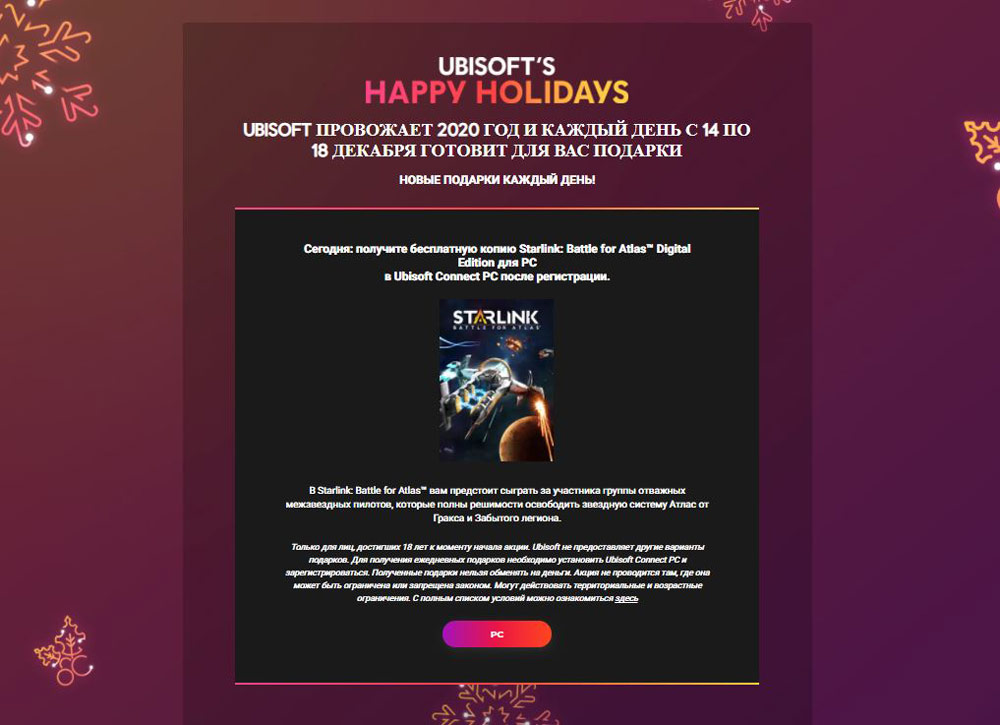Для того чтобы забрать игру, нужно сделать следующее. Переходим по ссылке на специальную страницу, посвящённую новогодним праздникам на сайте Ubisoft.
