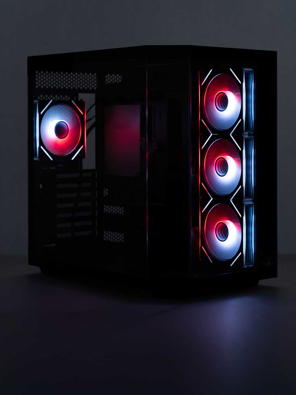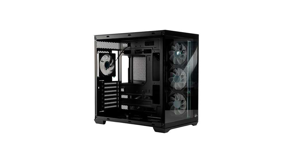 Его внутреннее пространство позволяет работать с компонентами значительных размеров, включая материнские платы стандарта E-ATX, видеокарты длиной 420 миллиметров и системы охлаждения процессора высотой до 155 мм. Базовая комплектация включает четыре предустановленных кулера формата 120 мм, формирующих движение воздушных потоков внутри корпуса и его продувку. При необходимости общее количество вентиляторов может быть увеличено до десяти штук за счет монтажа на передней, верхней, нижней и задней панелях. Конструкция также допускает интеграцию систем водяного охлаждения.