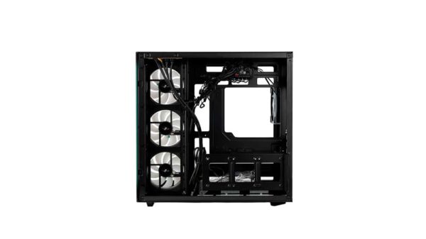 При производстве корпуса применялась сталь и закаленное стекло. Боковая и фронтальная панели из стекла являются съемными, что упрощает доступ к внутренним компонентам. Модель оборудована подсветкой ARGB. Размещенная в верхней части панель содержит два порта стандарта USB 3.2 Gen 1. Для монтажа накопителей предусмотрены два отсека для устройств формата 3.5 дюйма и три отсека для SSD на 2.5 дюйма.