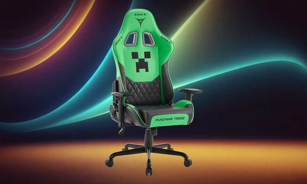 Модель CREEPER выделяется зелёной отделкой с чёрными акцентами, повторяющей текстуру персонажа. На спинке размещён его узнаваемый силуэт, а на сиденье — надпись “PUNCHING TREES”. Дополнительно комплектуется съёмными подушками для поясничного и шейного отделов.
